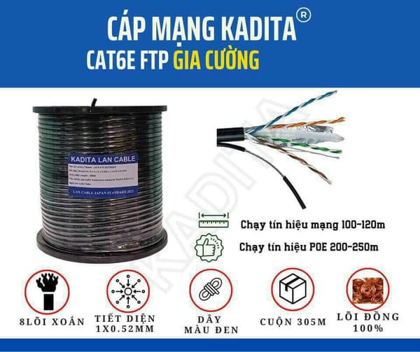 Cuộn 305m Cáp mạng ngoài trời Cat6E FTP chống nhiễu Kadita lõi đồng nguyên chất có cáp gia cường treo dây